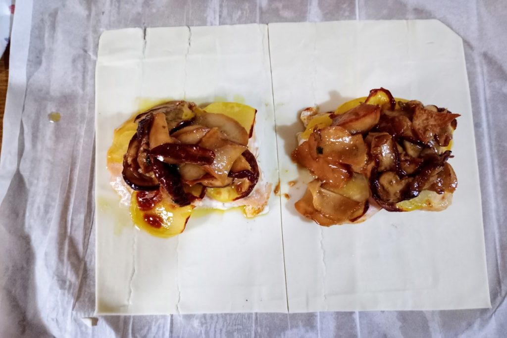 Más que un segundo, se podría definir un plato único, dada su consistencia: trozos de salmón rellenos con patatas y setas porcini, todo envuelto en una masa brisè.