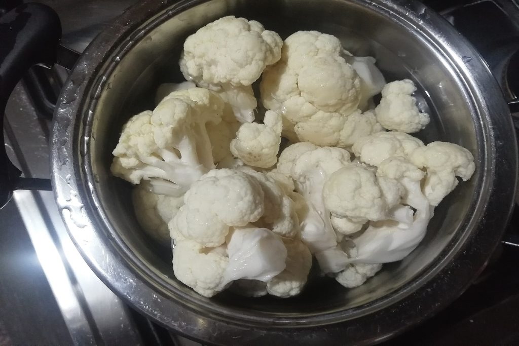 • Limpiamos la coliflor, cortamos las floretes y las ponemos a cocer en una olla con agua.