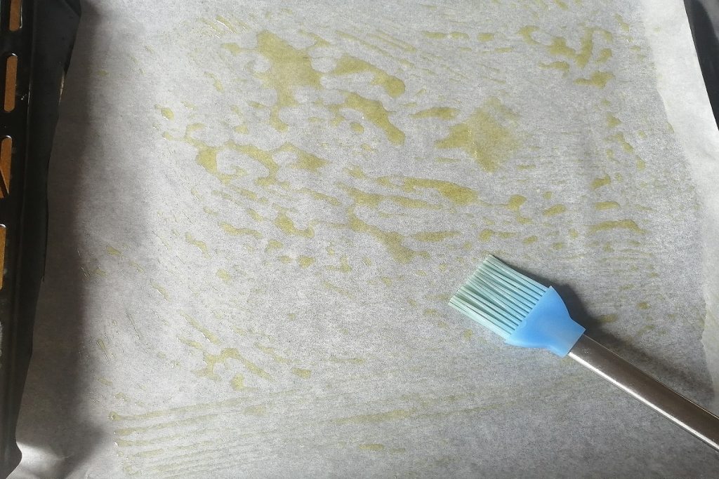 Preparamos una bandeja de horno cubierta con papel para hornear, vertemos un poco de aceite y lo untamos con un pincel.