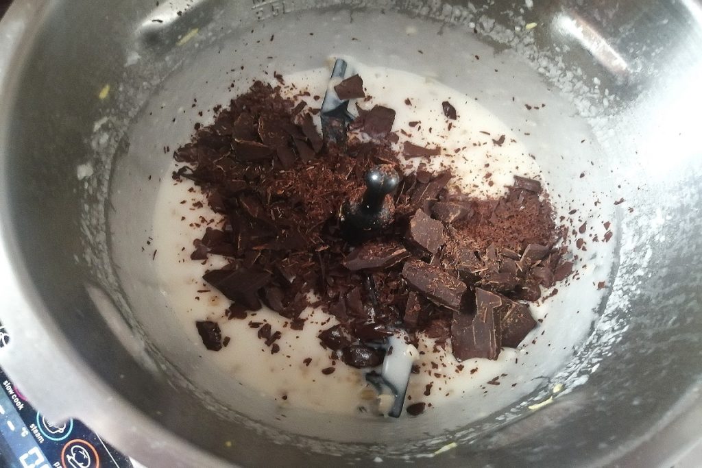 Cuando el trigo haya absorbido el líquido, apagamos e incorporamos el chocolate, mezclamos y dejamos enfriar.