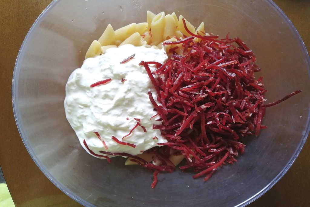 Al final de la cocción de la pasta, la escurrimos y la pasamos bajo agua fría y la vertemos en un ensaladera amplia.