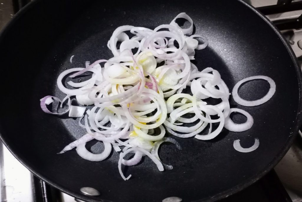 • En una sartén he vertido dos cucharadas de aceite de oliva virgen extra y he añadido la cebolleta fresca de tropea.