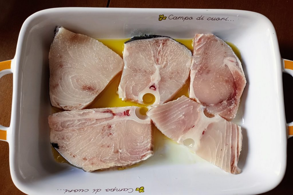 Colocamos los filetes de pez espada condimentados con sal y ajo en polvo en una fuente para horno con un poco de aceite EVO en el fondo.