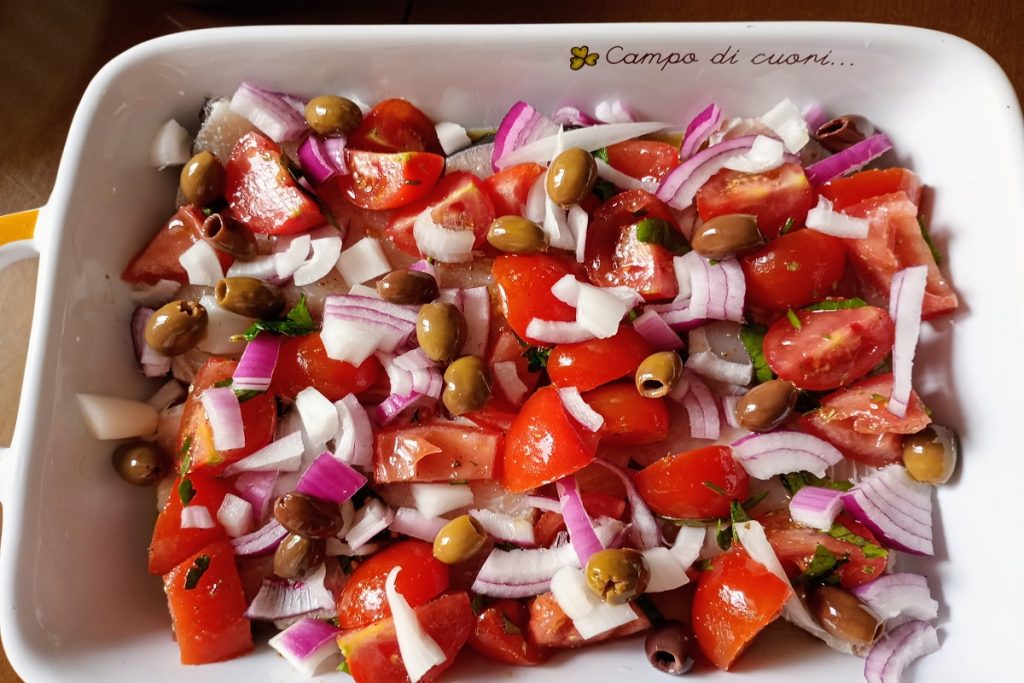 Los tomatitos piccadilly dulces y jugosos, el aroma de la cebolla fresca de Tropea y el orégano, la adición de aceitunas taggiasche hacen de este segundo plato una auténtica delicia.