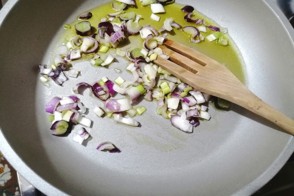 En una sartén comenzamos a dorar suavemente la cebolleta con un poco de aceite EVO.