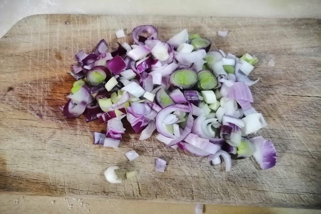 Limpiamos la cebolleta fresca y la cortamos finamente.