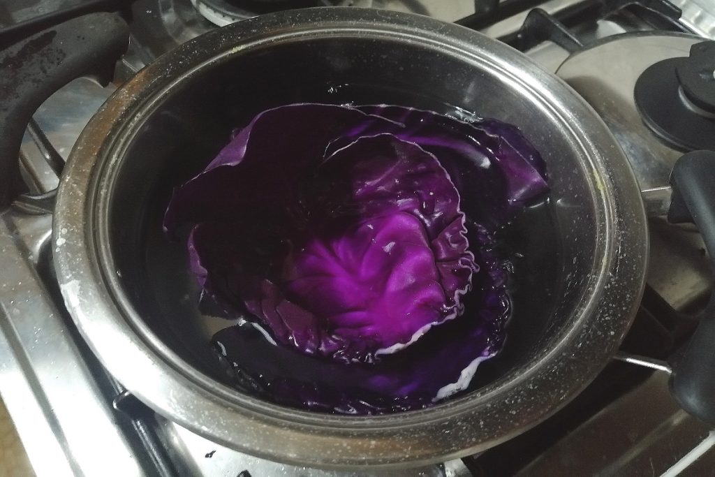 • Corta la col lombarda por la mitad, elimina las partes blancas duras y selecciona las hojas que necesitas.