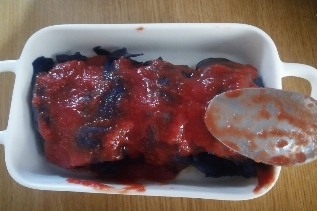 • Colocamos los rollitos en la fuente de horno y los untamos con un poco de aceite y luego cubrimos con la salsa de tomate.