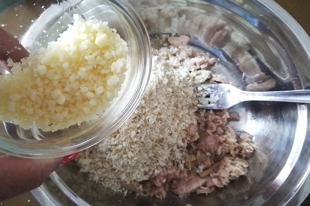 Mientras tanto, preparamos el relleno, vertiendo el atún escurrido en un bol, añadimos la miga de pan.