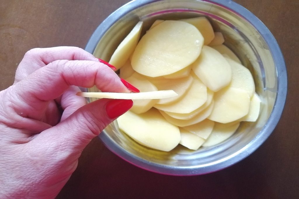 Comenzamos con la preparación de las patatas, pelándolas, lavándolas y cortándolas en rodajas finas.