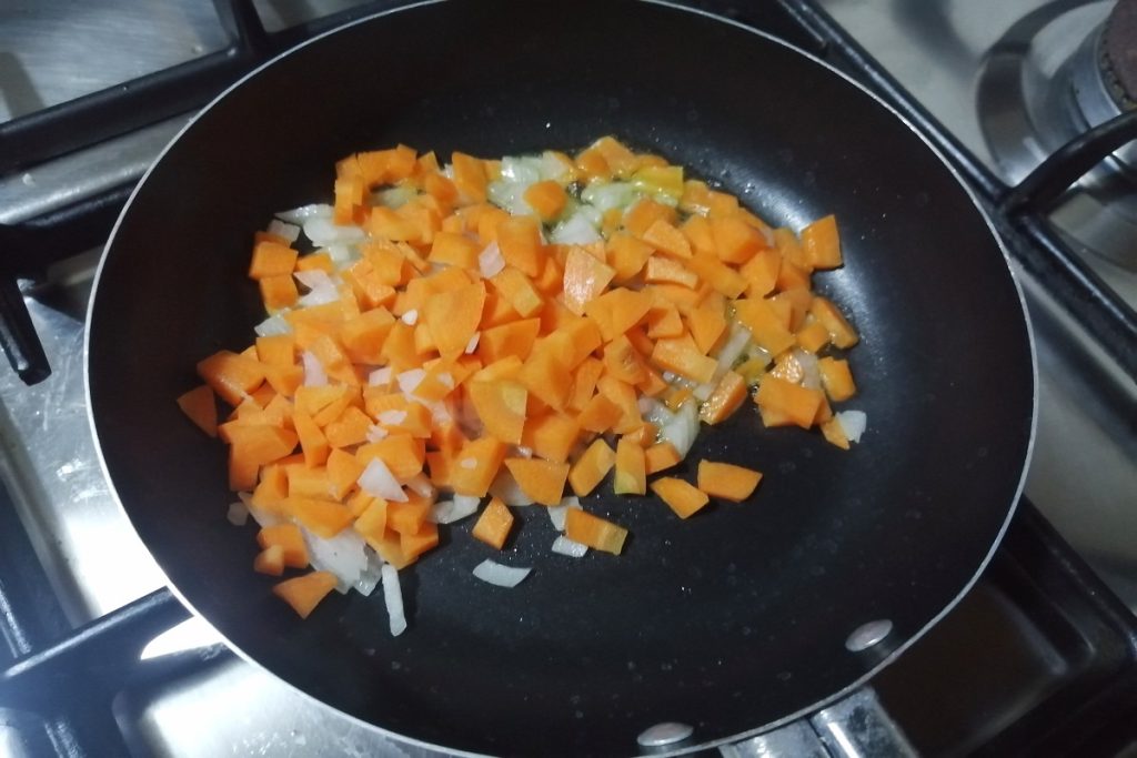 Limpiamos y cortamos en trozos pequeños la cebolla y la zanahoria.
