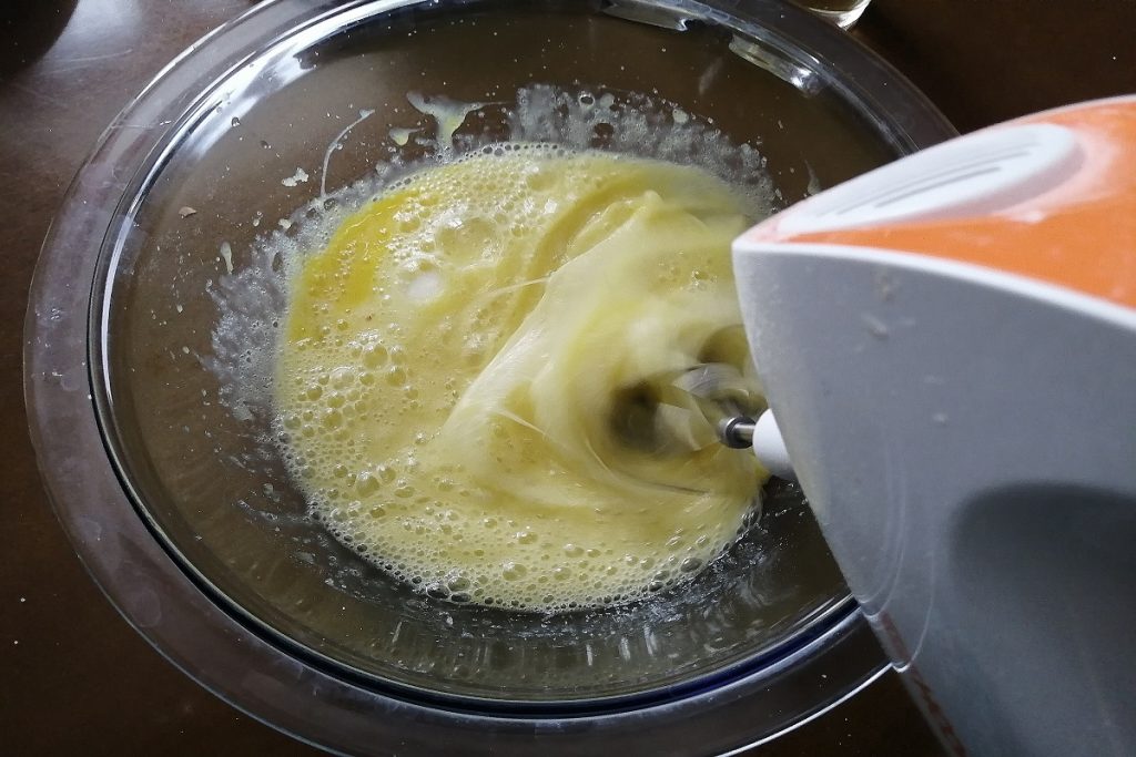 • Comenzamos preparando la base blanda vertiendo los huevos cascados en un bol con el azúcar, trabajamos con las varillas.