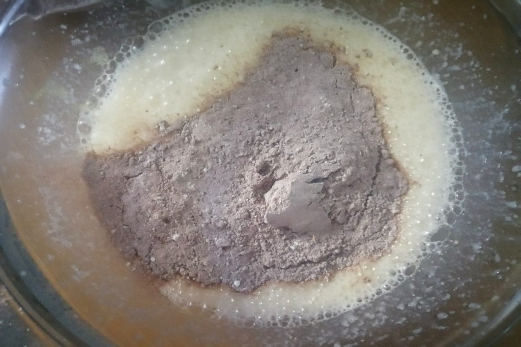 En un bol añade la harina de avena, el almidón de maíz, la levadura y el cacao.