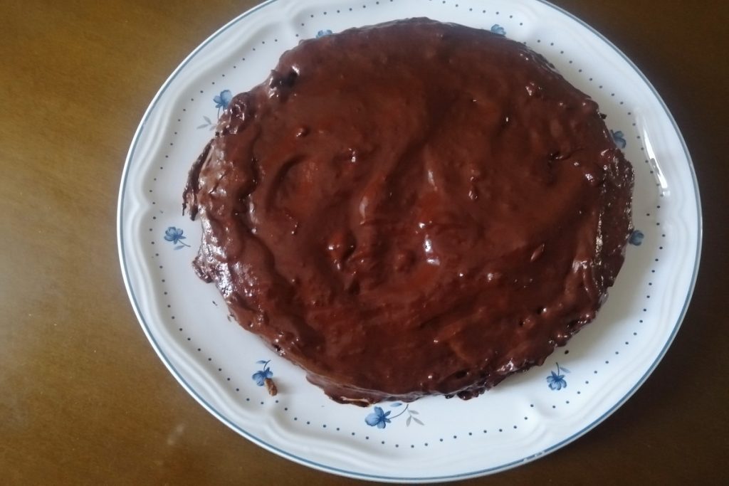 La masa está hecha solo con copos de avena, huevos y un plátano maduro, cocinada en el horno y luego cubierta con un glaseado de chocolate negro y harina de coco.