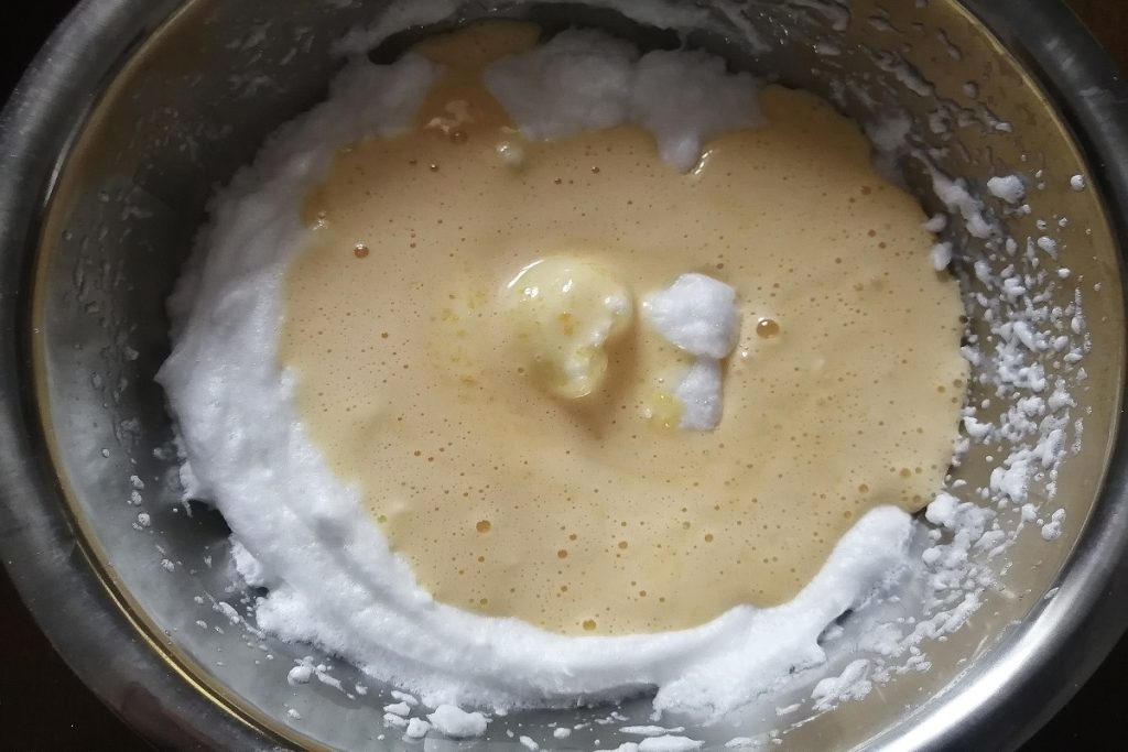 Incorporamos las yemas en las claras y el chocolate con la mantequilla derretida, mezclamos con una espátula de silicona de arriba abajo.