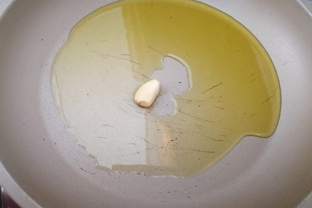 Tomamos una sartén amplia, considerando que luego deberá caber la pasta, y vertemos dentro el aceite de oliva virgen extra y un diente de ajo.