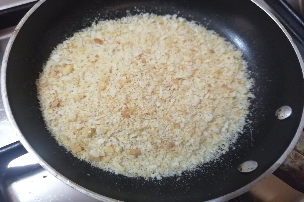 En otra sartén pequeña ponemos a dorar la miga de pan, mezclando frecuentemente para obtener una miga dorada.