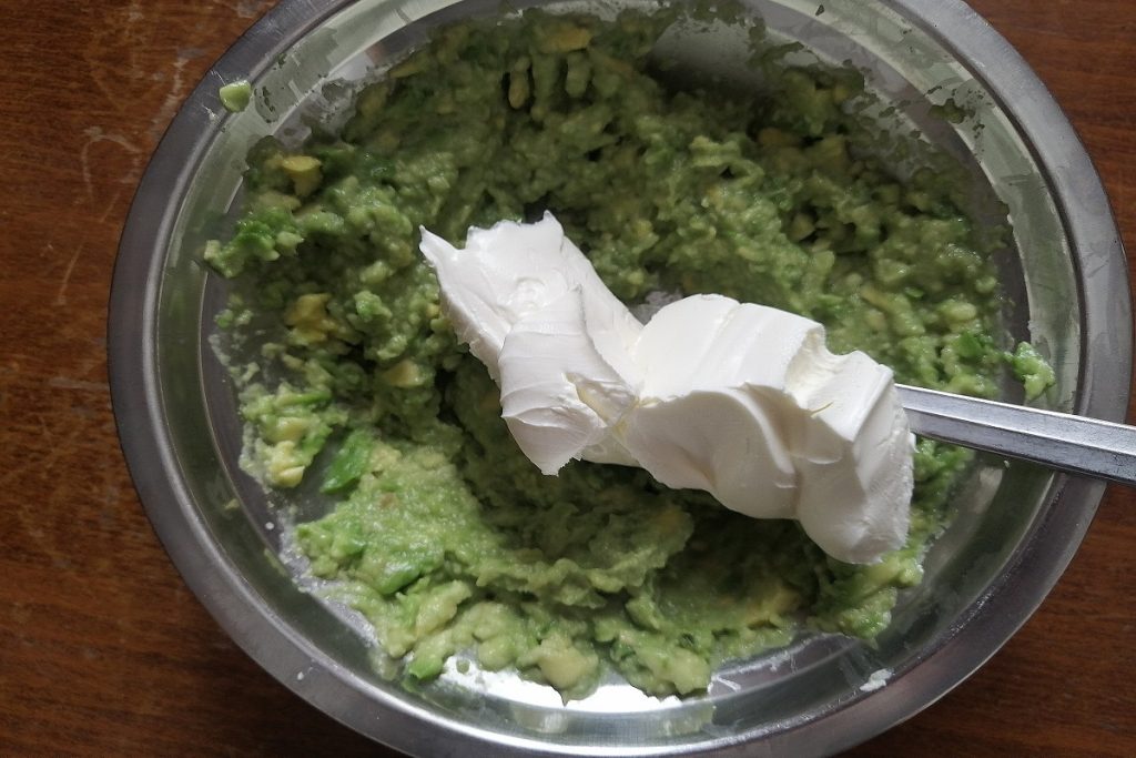 Pelamos y cortamos el aguacate maduro en trozos pequeños y lo trituramos con un tenedor.