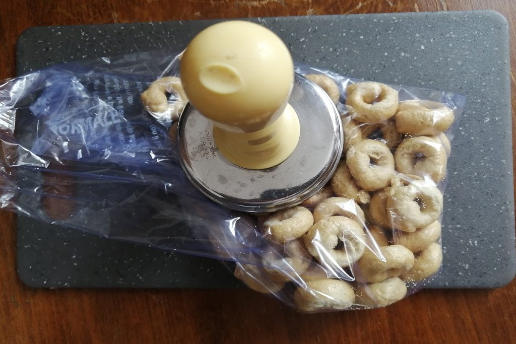 En una bolsa para alimentos ponemos los taralli y los trituramos con un mazo o rodillo.