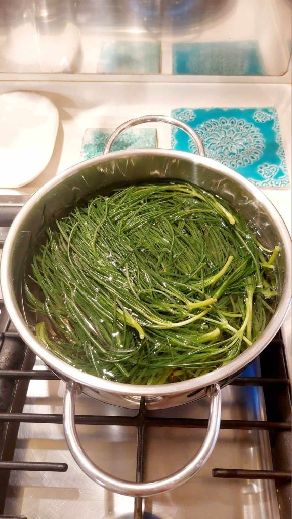 La manera más sencilla de cocinar los agretti es escaldarlos unos minutos en agua, luego pasarlos en agua con hielo o agua muy fría para mantener el color y servirlos simplemente con aceite y limón.