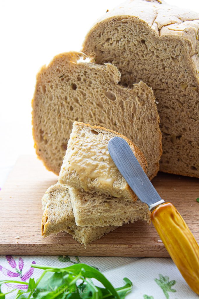 Este pan suave es pan de molde con rúcula y nueces, excelente untado con mantequilla de cacahuete, tahini o hummus de garbanzos.