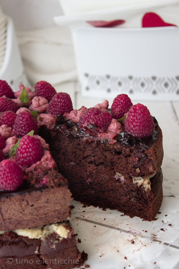 Tarta de chocolate rellena con compota de frambuesas y crema de anacardos. Sencilla de preparar, con poco azúcar, harina semi integral y chocolate. Son dos corazones de masa de torta moretta vegetal, pero naturalmente la puedes realizar también con ingredientes tradicionales.