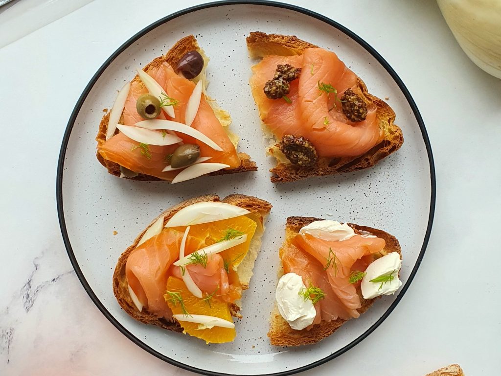 ¡Tus deliciosas bruschettas con salmón ahumado están listas!