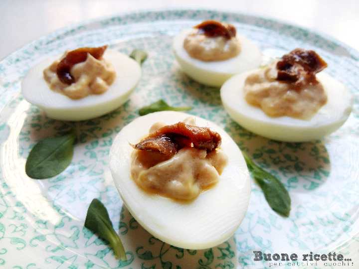 Solo os queda decorar y completar vuestros huevos rellenos. Aquí depende mucho del gusto personal, yo utilizo filetes de anchoa, alcaparras en sal, pepinillos en rodajas, pimientos secos.