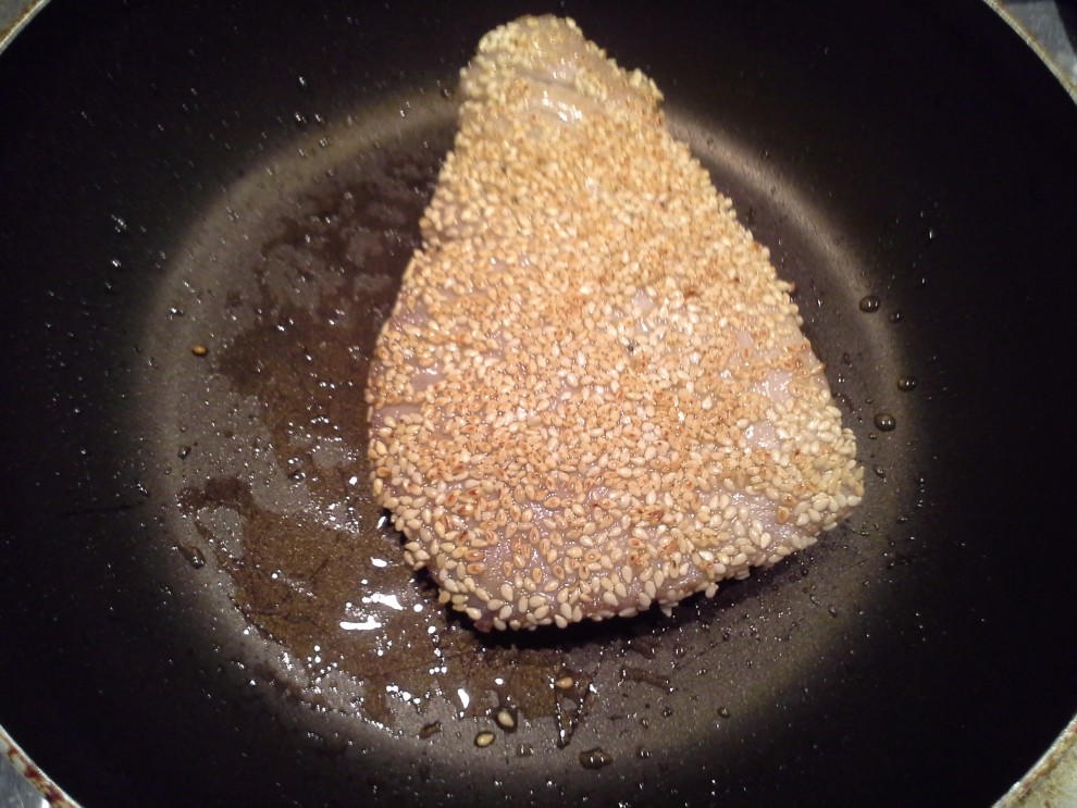Después de un par de minutos gira el filete ayudándote con una cuchara o un tenedor. El empanado de sésamo es bastante friable. gíralo con cuidado podrías desprenderla del pez espada.