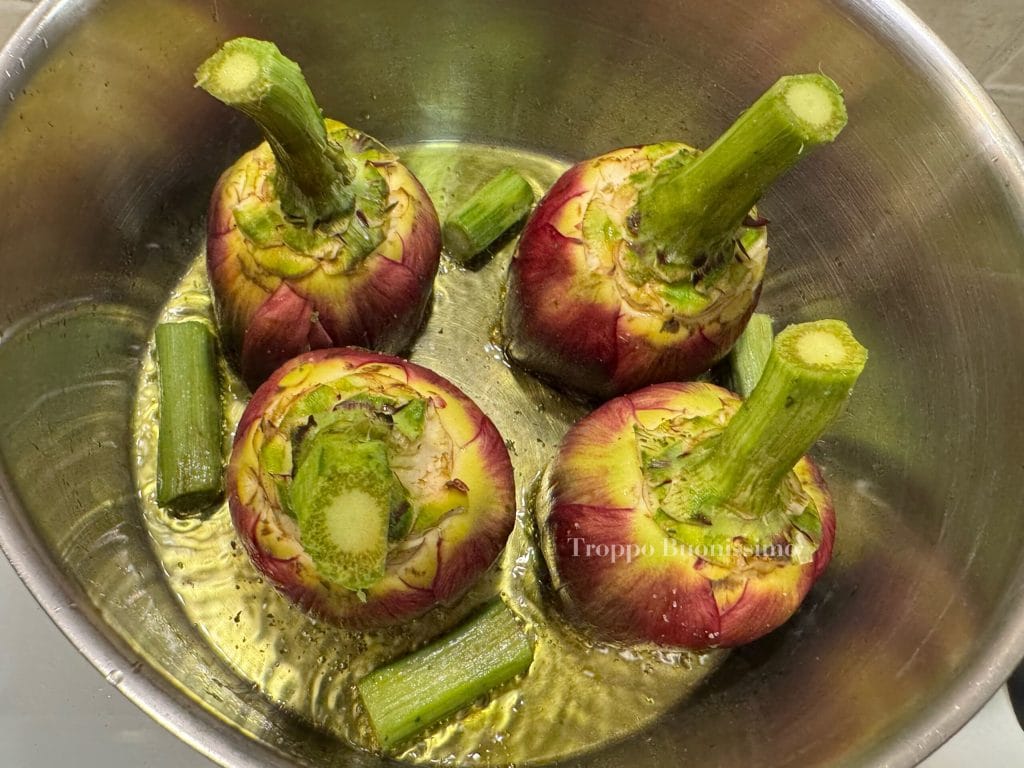 Vierte en una cacerola un generoso chorro de aceite de oliva virgen extra, coloca las alcachofas con los tallos hacia arriba, cerca una de la otra para que se mantengan en posición durante la cocción.Cuando la parte superior de las alcachofas esté dorada, colócalas de lado y continúa dorándolas, girándolas delicadamente por todos los lados con la ayuda de unas pinzas. Una vez bien doradas, añade el vino blanco. Cuando el alcohol se haya evaporado por completo, añade el agua caliente, asegurándote de que cubra las alcachofas hasta la mitad, no más.