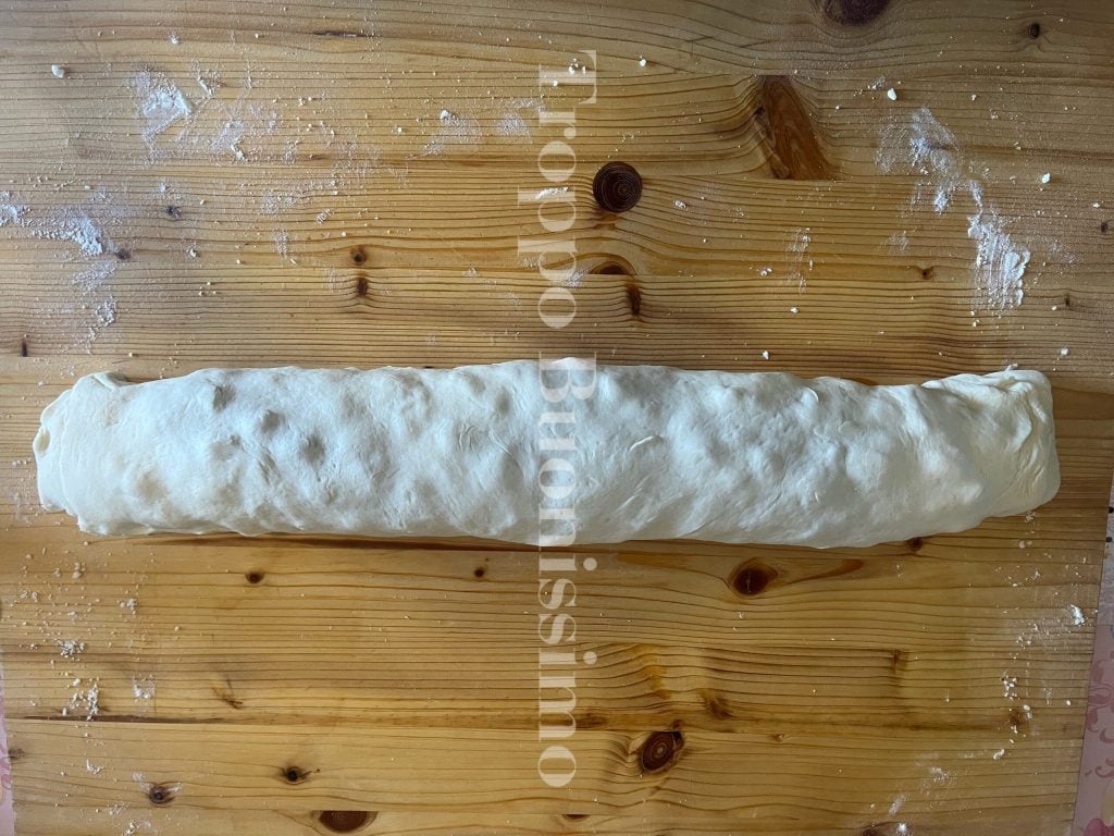 Transcurrido el tiempo de leudado, vuelca la masa sobre una tabla de amasar enharinada, toma un trozo grande de unos 70/80 g y resérvalo para hacer las cruces sobre los huevos. Estira el resto de la masa con el rodillo hasta formar un rectángulo de aproximadamente 50×40. Distribuye los ingredientes para el relleno por toda la superficie, dejando libre aproximadamente 1 cm del borde.