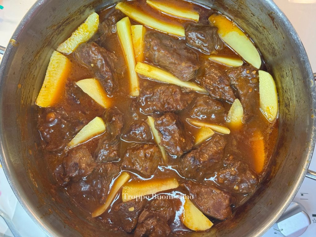 La carne, cocida lentamente en vino tinto y caldo de verduras, se vuelve suavísima y se envuelve en una salsa densa y aterciopelada. Las patatas, además, absorben todo el sabor, haciendo el plato irresistible.