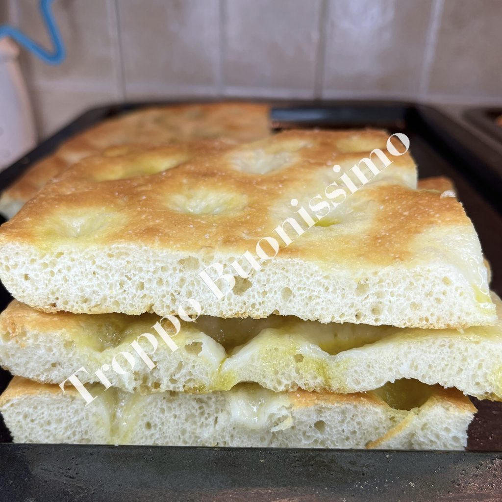 Una focaccia crujiente y sabrosa, perfecta para disfrutar sola o acompañada de jamón, queso u otros ingredientes a tu gusto.