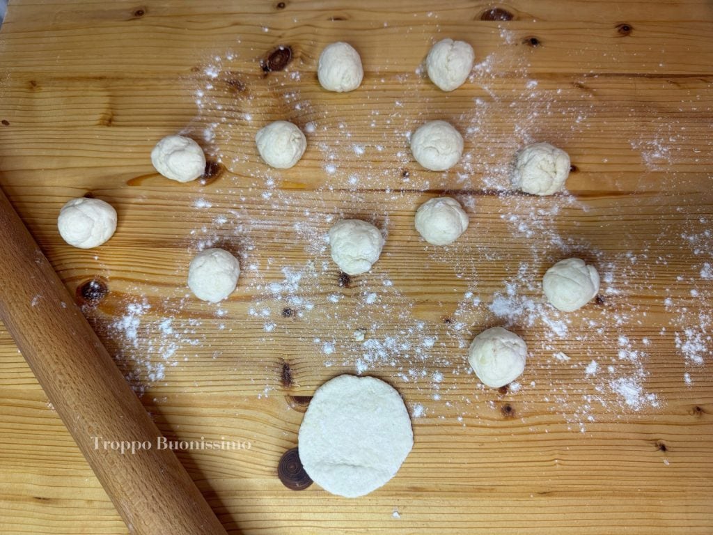 Transfiere la masa a la superficie de trabajo ligeramente enharinada y amasa brevemente hasta formar una bola lisa.Una vez obtenida una masa lisa, separa bolitas de aproximadamente 20-25 g cada una.