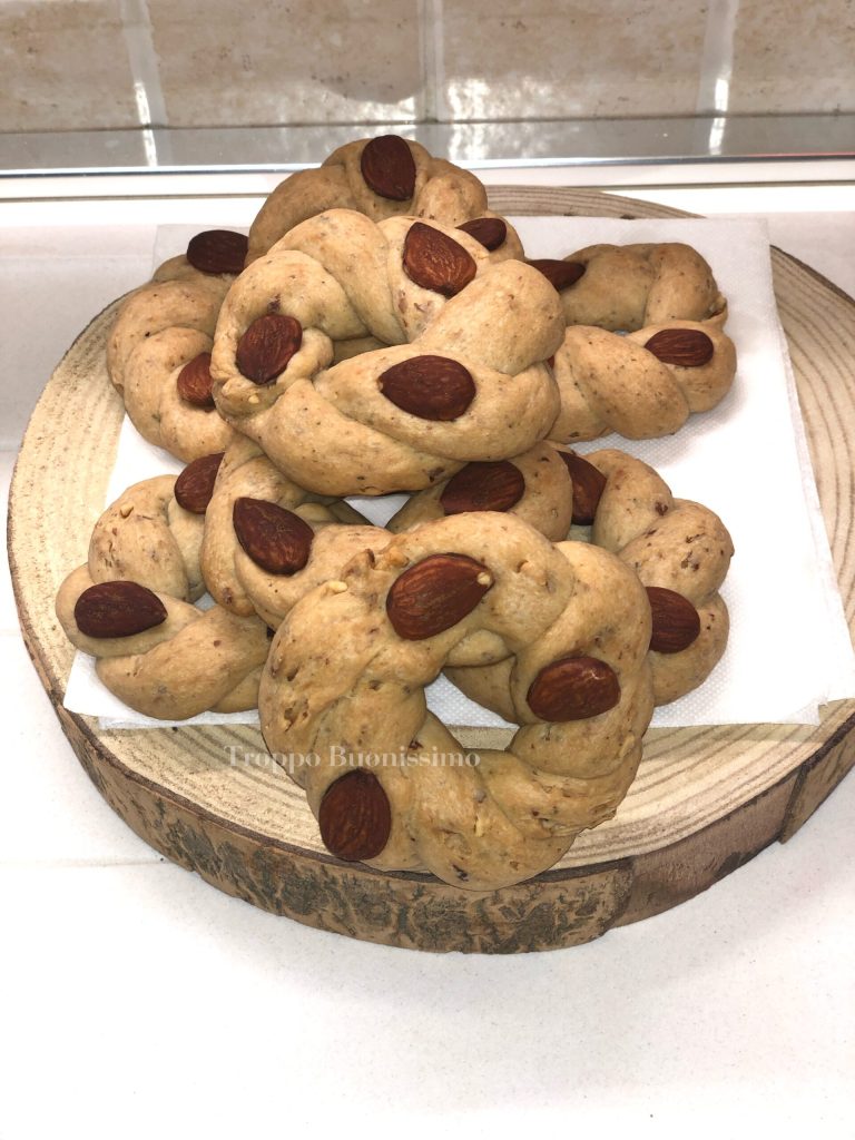 2. Inserta las almendras dentro del entrelazado de cada tarallo.1. Cubre los taralli con un paño y déjalos reposar en un lugar cálido durante 2-3 horas.