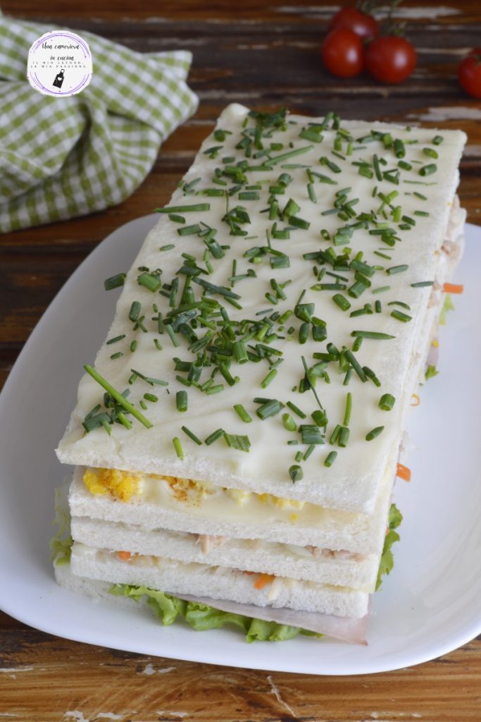 Una novedad de los últimos años es el bloque de sándwich. El clásico bocadillo para picar, el sándwich, se transforma en una especie de pastel salado, realmente sabroso, para rellenar como más te guste. Yo en mi bloque utilicé los ingredientes que ya tenía en casa, pero puedes rellenarlo también con otros ingredientes que tengas a disposición o de tu agrado. Yo lo rellené con jamón cocido, queso edam, huevos duros, mayonesa, lechuga gentil, verduras en escabeche, atún y alcaparras. Sazonado luego con cebollino y pimentón. Fácil, rápido y económico, también es ideal para «vaciar la nevera» y servirlo para el aperitivo, como entrante o tentempié salado.