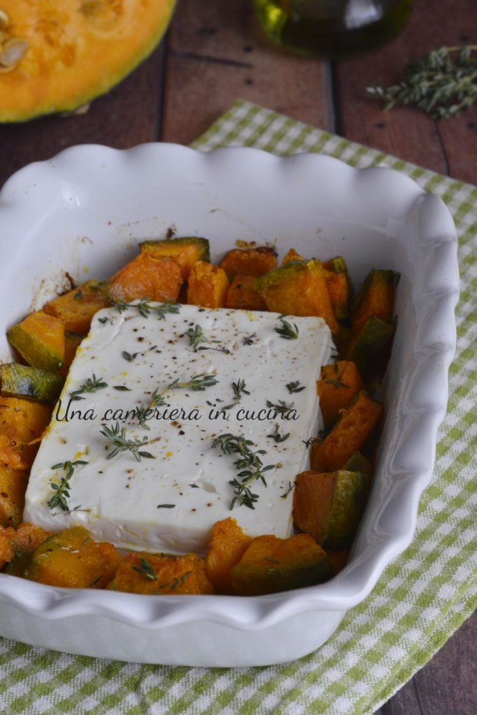Una vez transcurridos los minutos de cocción de la calabaza, quítala del horno, en el centro de la fuente coloca la feta e introduce de nuevo al horno por otros 10 minutos a 180 grados en modo ventilado.