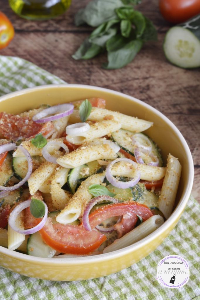 ¿Os gusta la panzanella toscana? ¡Entonces tenéis que probar también la panzanella de pasta!!! Un primer plato fresco, sabroso y ligero que se prepara en pocos minutos, ¡ideal para la temporada cálida! Para esta receta he elegido las penne rigate y luego las he condimentado con los ingredientes clásicos de la panzanella, es decir, tomate, como el San Marzano o los que prefiráis), el pepino, la cebolla roja (yo he utilizado la de Tropea, dulce y no demasiado fuerte para comer cruda) y algunas hojas de albahaca. En lugar del pan remojado en agua, lo he sustituido con pan rallado tostado en sartén y añadir al final.