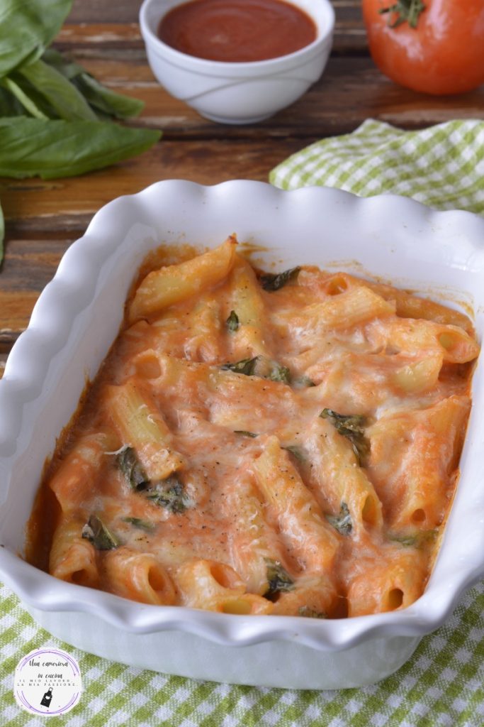 Para la Fiesta de la República Italiana preparé la pasta gratinada con tomate y mozzarella, un primer plato sencillo y sabroso que recuerda los colores de la bandera italiana. Para la receta utilicé penne rigate, pero podéis elegir cualquier otro formato. Luego las condimenté con la salsa aurora o besamel roja, mozzarella y algunas hojas de albahaca.