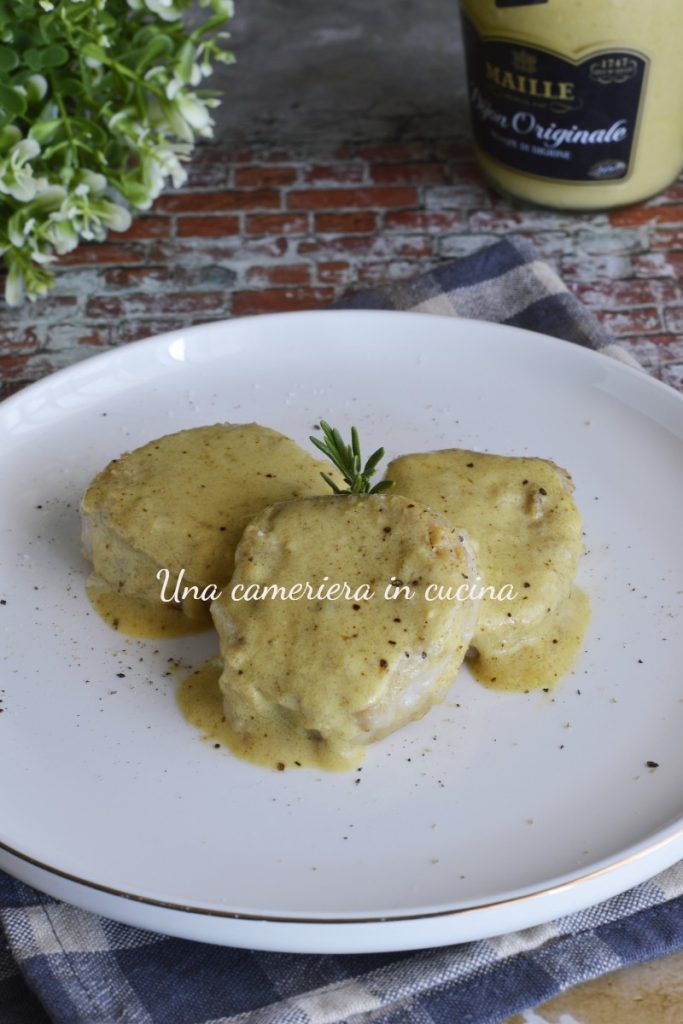 El solomillo de cerdo a la mostaza sin nata es un segundo plato de carne rápido y sabroso. El solomillo se corta en medallones, rodajas redondas no demasiado gruesas, ligeramente enharinadas y cocidas en sartén con mantequilla, mostaza de Dijon y un poco de caldo. Para servir en ocasiones especiales, acompañándolo con una guarnición de patatas o puré de patatas.