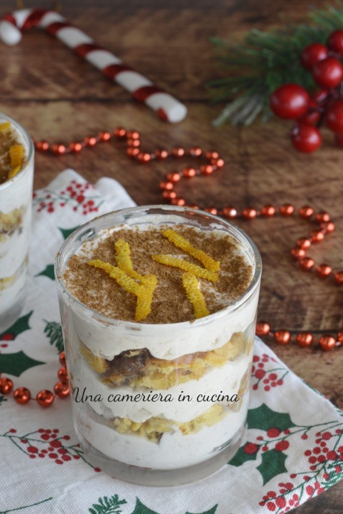 Los vasos de panettone son súper deliciosos y fáciles de preparar. Una receta perfecta para Navidad o para las fiestas navideñas posteriores, ideal también para reciclar el panettone al final de estas. Dos capas de panettone empapado en licor, en este caso el Grand Marnier, alternadas con una doble capa de crema a base de nata y queso fresco para untar, enriquecida con trocitos de naranja confitada y aromatizada con canela. Para la receta preferí crear porciones individuales en cómodos vasos, pero si lo prefieres, puedes hacerlo en una bandeja.