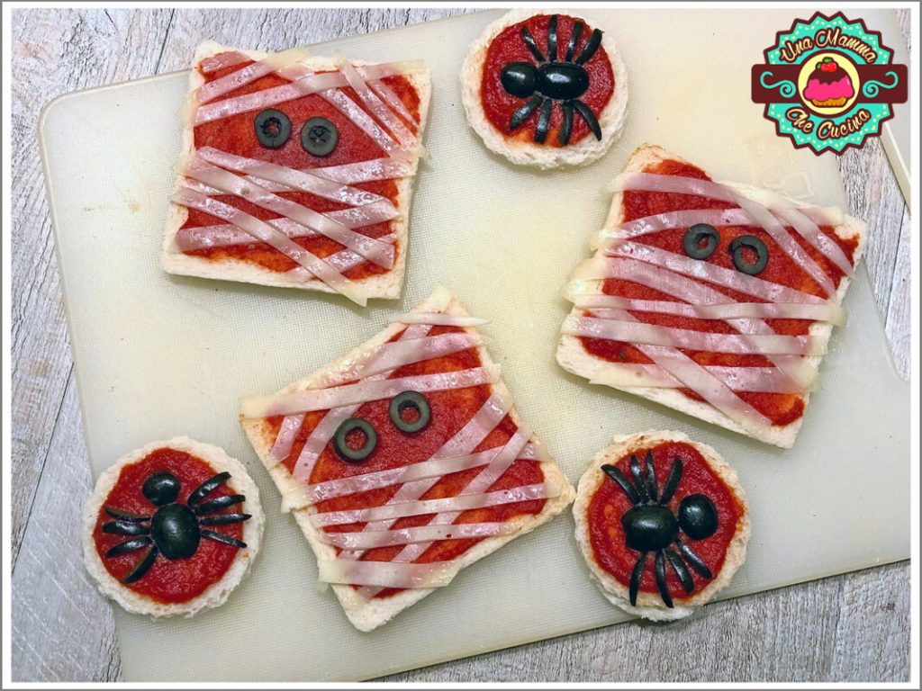 Tuesta las rebanadas de pan en una sartén por ambos lados. Añade dos cucharadas de salsa de tomate en cada rebanada, extiéndelas bien hasta los bordes y coloca dos trocitos de aceitunas cortadas en rodajas para hacer los ojos de las momias.