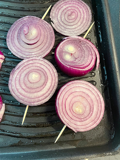 Pela las cebollas, córtalas en rodajas de aproximadamente un centímetro de grosor y ensártalas con un palillo hasta la mitad. De esta manera, cuando las gires, permanecerán enteras. Colócalas en la parrilla bien caliente y cocínalas a fuego medio-bajo durante un par de minutos.