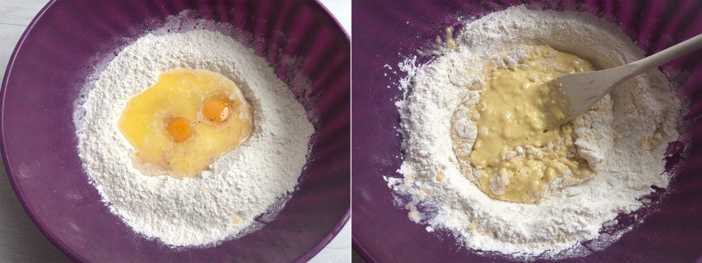 Primero, pon en un bol la harina, el azúcar y la sal, luego haz un hueco en el centro y añade 2 huevos, leche, extracto de vainilla y mantequilla derretida. Mezcla con una cuchara llevando la harina al centro y ayúdate con las manos para formar una bola.