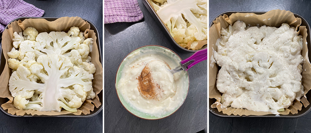 Yo corté la coliflor en rodajas porque me gustaba así, pero simplemente puedes dividirla en floretes, la cocción no cambia.