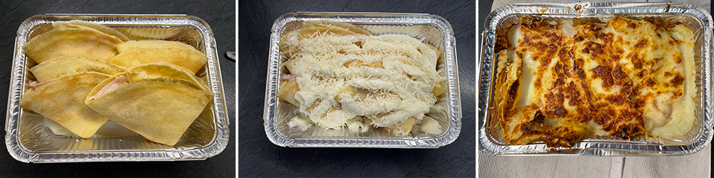 • En cada crepe pon un poco de bechamel, los quesos y el jamón.