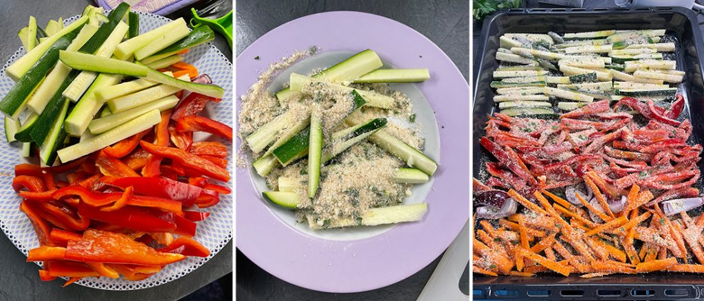 Ahora corta las verduras en palitos y mézclalas bien asegurando que se adhiera el pan rallado, luego colócalas en una bandeja sin sobreponerlas demasiado. Rocíalas con un poco de aceite y otra pizca de sal.