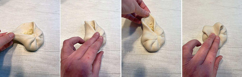 Ahora pliega los bordes sobre el relleno, de manera que cubras todo el queso como en las fotos. Si prefieres, pliega simplemente a media luna, sellando bien los bordes.