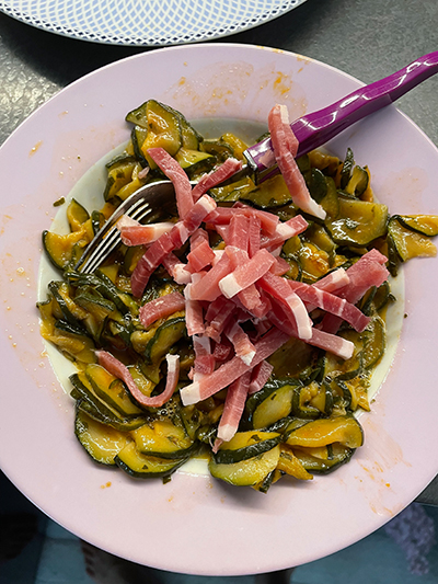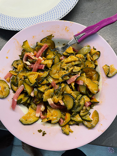 Vierte los calabacines en un plato y, una vez estén templados, añade un huevo batido y el speck.