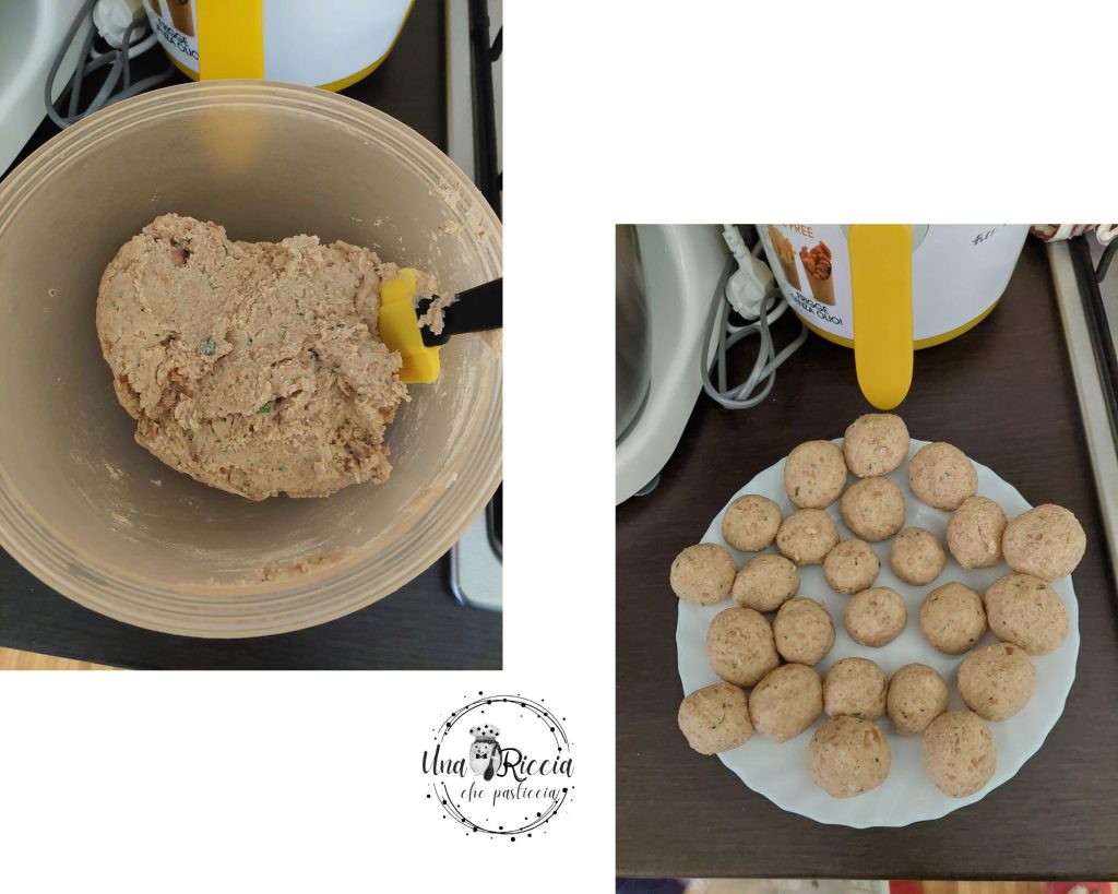 Dejamos funcionar el mezclador a velocidad media durante tres o cuatro minutos y hasta que veamos todos los ingredientes bien integrados. Debemos obtener una mezcla homogénea, suave y manejable. Vertemos la mezcla obtenida en un bol y formamos nuestras albóndigas de alubias. Tomamos una cantidad de masa un poco más grande que una nuez y formamos una bolita, continuamos hasta agotar la mezcla colocándolas en un plato.